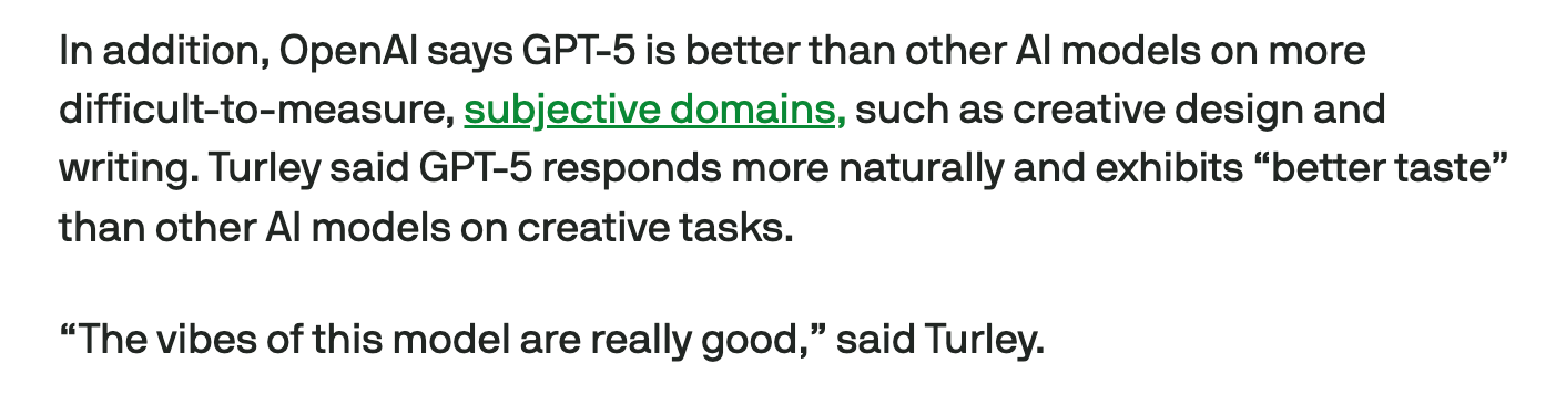 perhaps the clearest sign that openai recognizes gpt-5 is technically underwhelming: they’re moving the goalposts and shifting the spotlight to non-technical “wins” like pricing and “taste.”